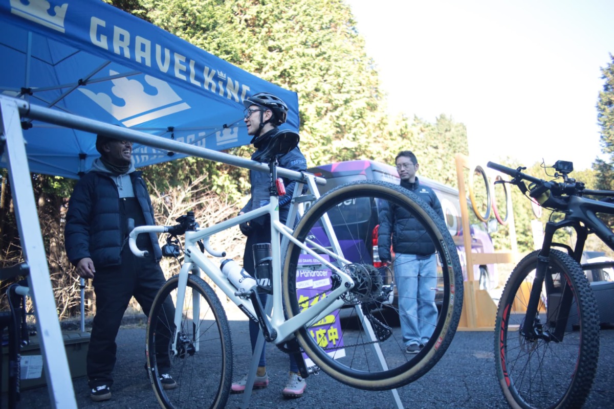 序盤の20km地点にある第一エイドでは、Santa Cruz、Reserveなどを展開するウィンクレル株式会社が参加者を迎えた。グラベルバイクの展示のほか、パラチノースを配合したライスピュレの配布もあり、参加者は補給を片手にスタッフへ質問を投げかけ、製品の話で盛り上がる場面も多かった。走るだけでは終わらない“イベントの厚み”が、ここで一段増した。