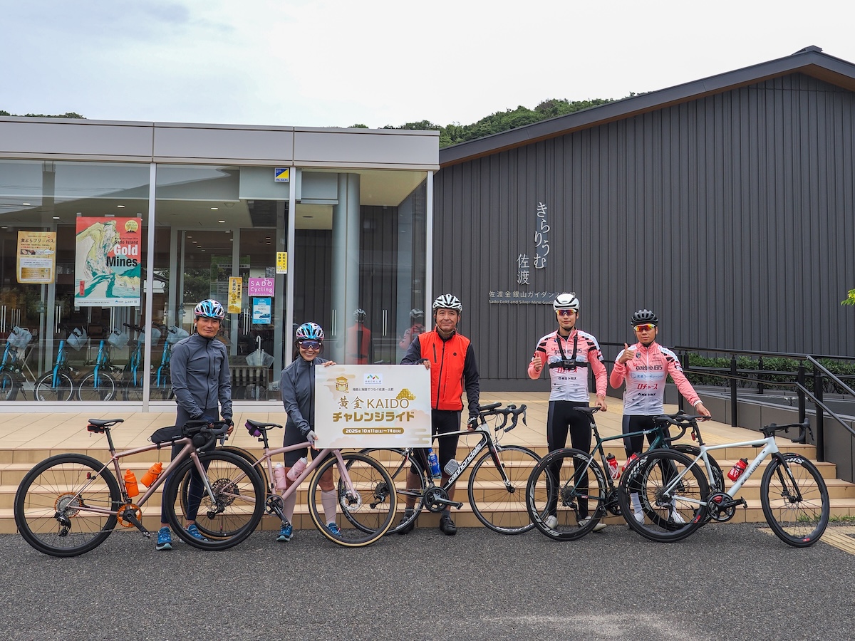 スタートは佐渡金銀山のガイダンス施設、きらりうむ佐渡。参加者3名と佐渡ゴールデンアイビスの重田倫一郎選手(右から2番目)、鈴木道也選手(右)の5名でサイクリング
