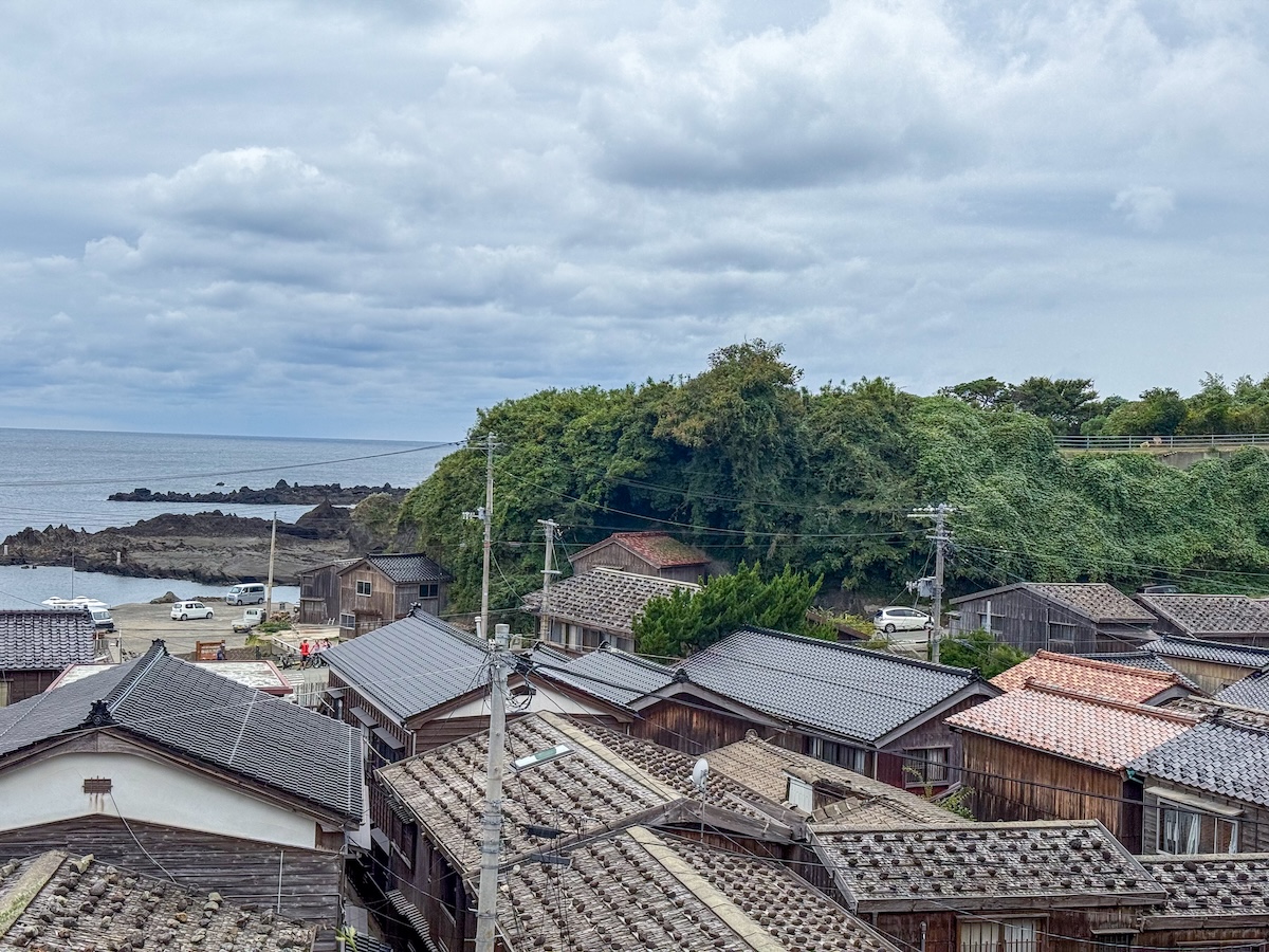 5名は佐渡島の西側を通って南へ。島の突き出した海岸線を回ると、山と海の景色が一変して走っていて飽きない。適度なアップダウンが心地よく、重田・鈴木両選手から「地元ならではの話」を聞くこともできて、雰囲気は和やかだ。佐和田(さわた)海水浴場のあめやの桟橋、田切須(たぎりす)のヤブツバキ林、宿根木(しゅくねぎ)の集落を見て回りながら、小木港を目指した。