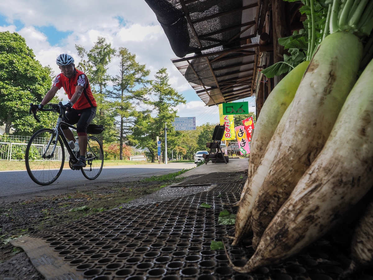 3日目、みなさんに昨日の疲れが残っていないかを確かめるように田代さんが集団の先頭に立って走りだす。この日の最初の目的地は50km先にある道の駅、今井恵みの里。ルートは、国道147号線の西側を通る、日本アルプスサラダ街道。クルマの通りが少なく、サイクリストが安心して走れる道だ。黄金KAIDOは、そんな走りやすいルートを選んで設定されている。