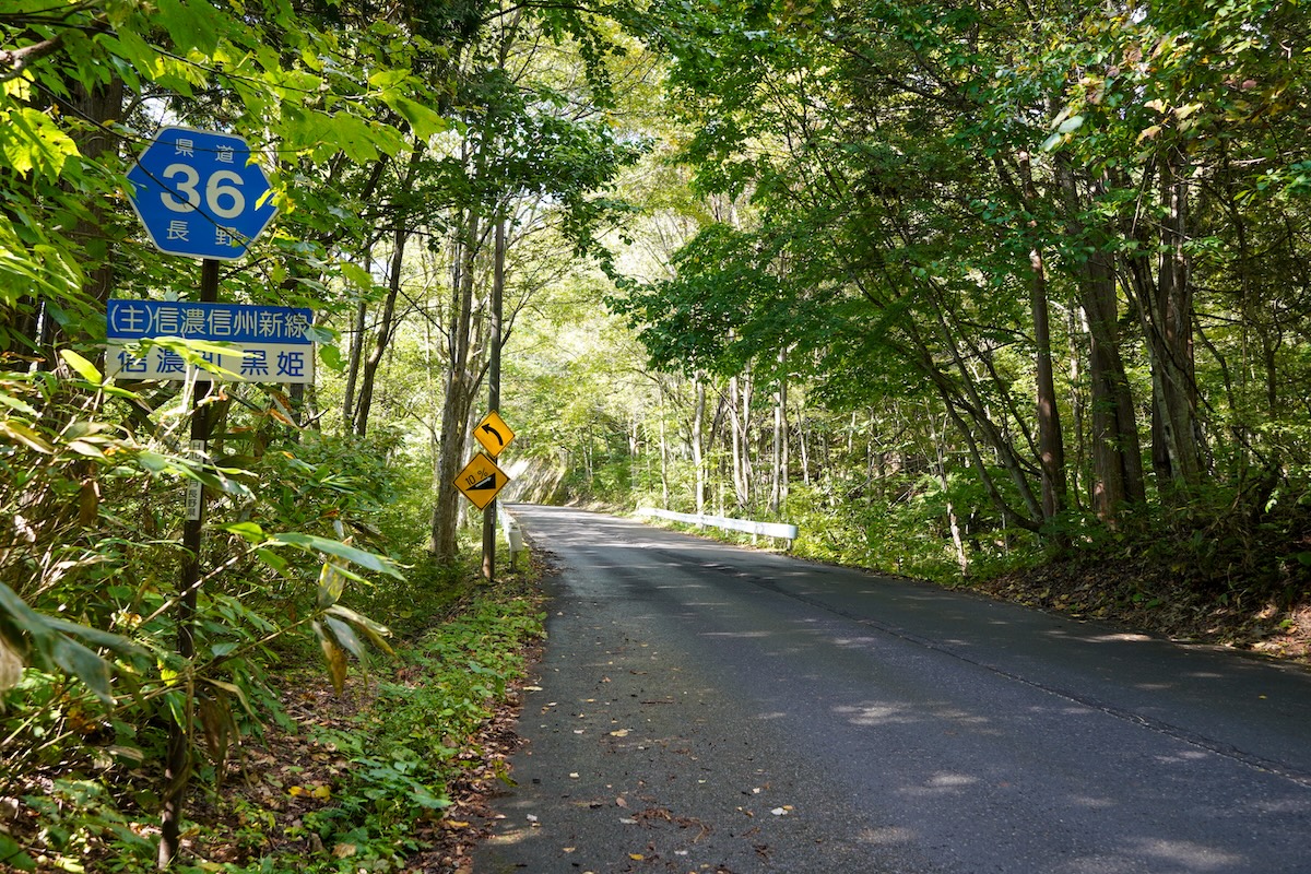 勾配のきつい坂が多い信濃信州新線(県道36号)。黒姫や戸隠などの観光ルートにもなっている