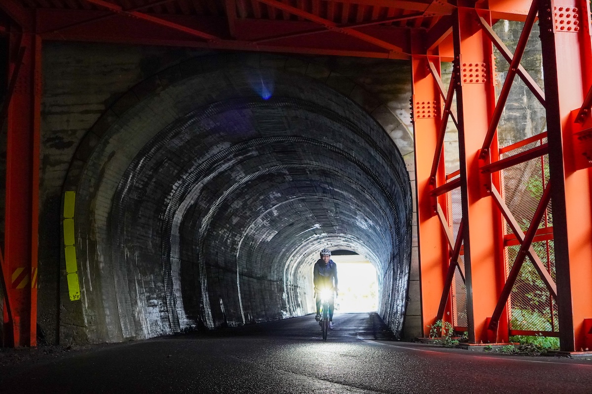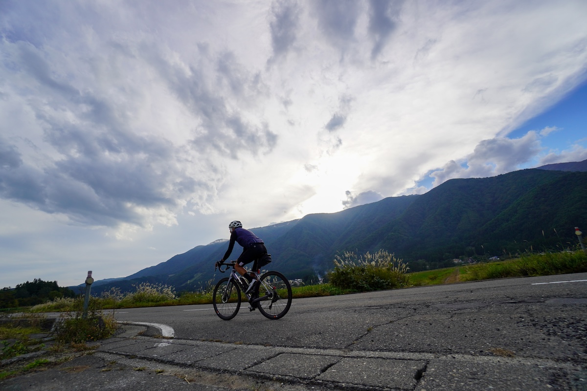 ランチを早めに済ませた山田さんは、「上りは苦手だから」とひと足早く白沢峠へと向かっていく。県道406号を約15km上って白馬村へとつながる白沢洞門をくぐると北アルプスが出迎えてくれる。ここまで走り抜いてきたサイクリストへの自然からの贈り物のようだった。