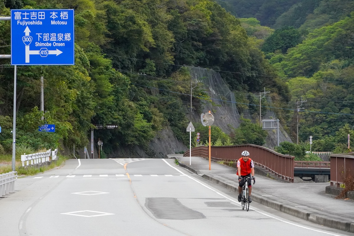 出発後、富士川大橋を渡り、県道9号と国道300号(本栖みち)を使って身延町へ、この区間は心地よい下り坂が続きペースも快調だ。途中に短い距離の峠があるものの、2日目に60km近い上りを経験しているので苦にならない。下部温泉を通過し、まるで駆け抜けるように一気に40kmの道のりを進んだ。