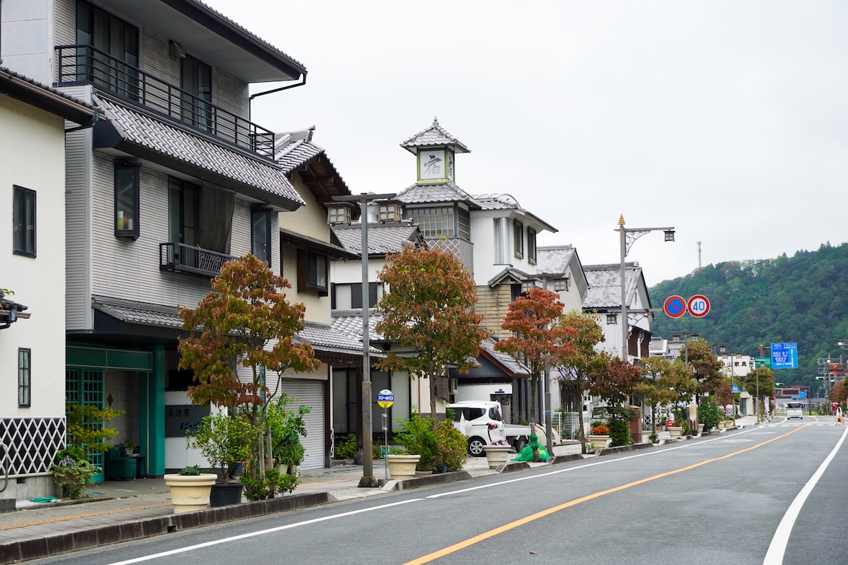 JR身延駅前のしょうにん通り。瓦屋根と白壁づくりの建物が並ぶ