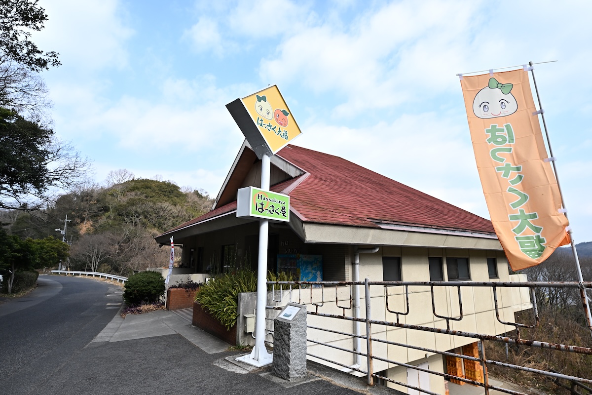 因島大橋記念公園へ降りる坂の途中、我々はとある店へ立ち寄ろうとしていた。「はっさく屋」だ。