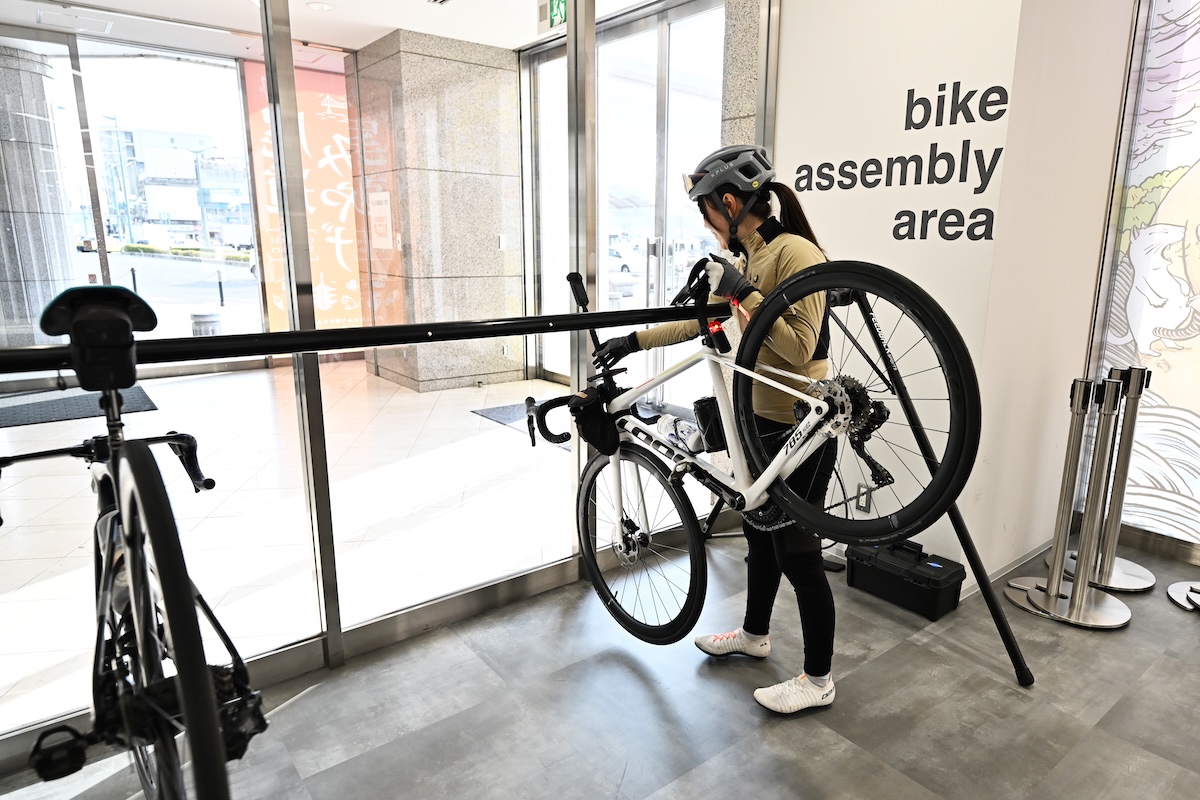 ここは単に自転車を借りれるだけの場所ではない。広々としたスペースは自身のロードバイクを持ち込むサイクリストにとっても、輪行解除の拠点として非常に使い勝手が良い。ラックにフロアポンプ、工具も完備されており、出発前の調整も万全だ。ここで準備を整え、我々はペダルを漕ぎ出した。