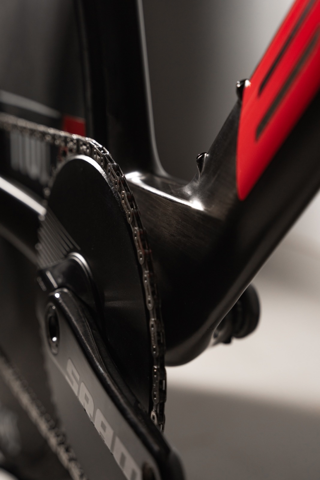 また、ボトムブラケット周辺には左右非対称の「Mariana(マリアナ)BB」を導入。ドライブサイドとノンドライブサイドで形状を変えることで、巨大なチェーンリング(シングル・ダブル対応)を許容しつつ、最適なエアフローを実現した。