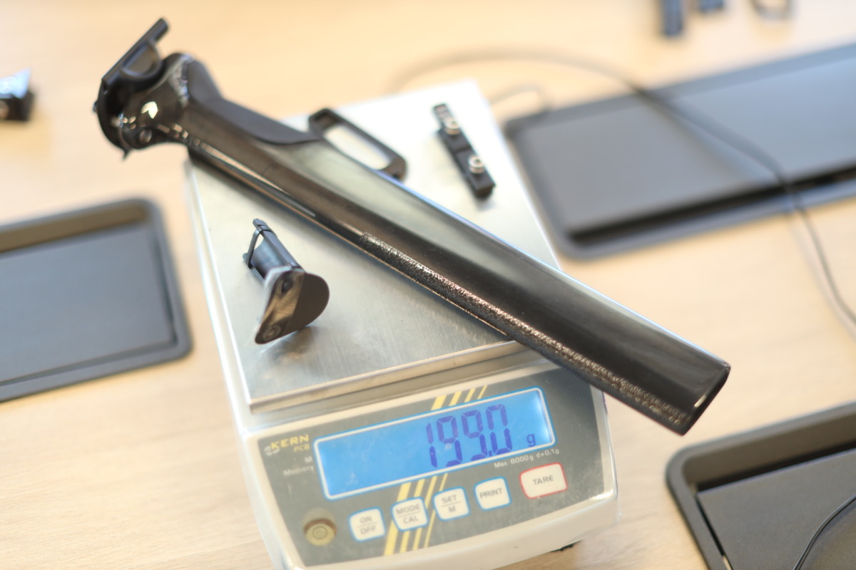 新しくオフセットをなしにしたシートポスト。撮影したものでは小物を含めては199gとクランプ方式を変えることで軽くしている