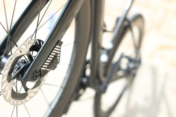 第4世代では最大30mmだったクリアランスが、第5世代では最大32mm(5mmクリアランス確保)へ拡大された。チェーンステーは408mmから410mmへ延長。これによりワイドタイヤ装着時の安定性と空力の両立を図っている。近年のレースでは28〜30mmが主流であり、空気抵抗・転がり抵抗・快適性の総合バランスを考慮すれば妥当な進化といえる。