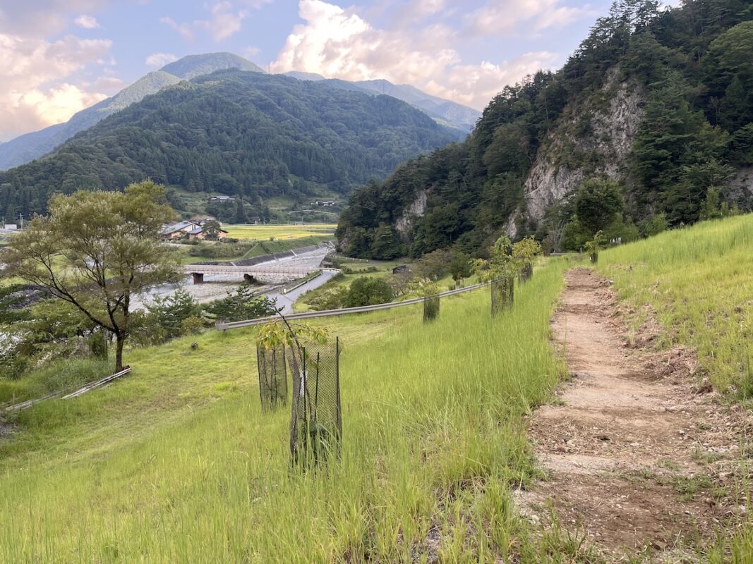 大池高原の本格コースに加え、村の若者や子どもたちがMTBをより身近に楽しめるよう、地域おこし協力隊のダニエル・クレマス氏が中心となり、保育園や小学校に近い「大西公園」の遊歩道をMTB練習用トレイルへと復活させるプロジェクトが進行中だ。