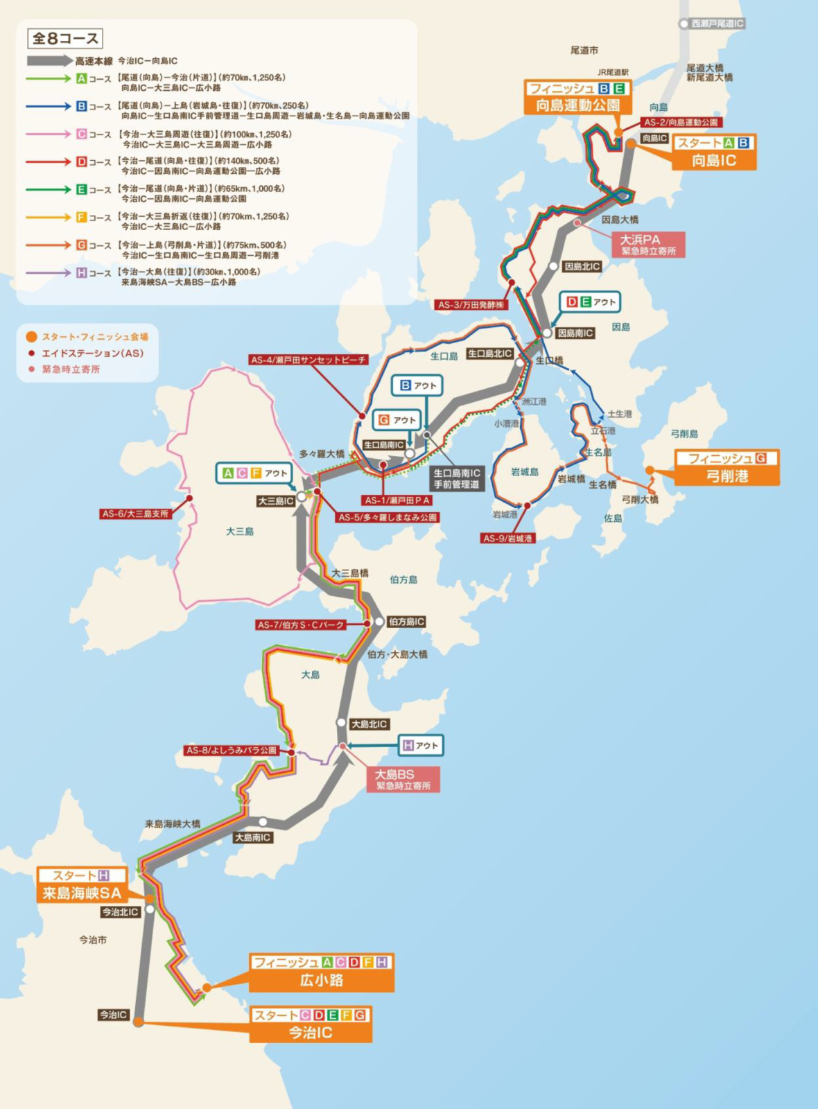 - スタート:西瀬戸自動車道今治IC・来島海峡SA(今治市)、向島IC(尾道市)
