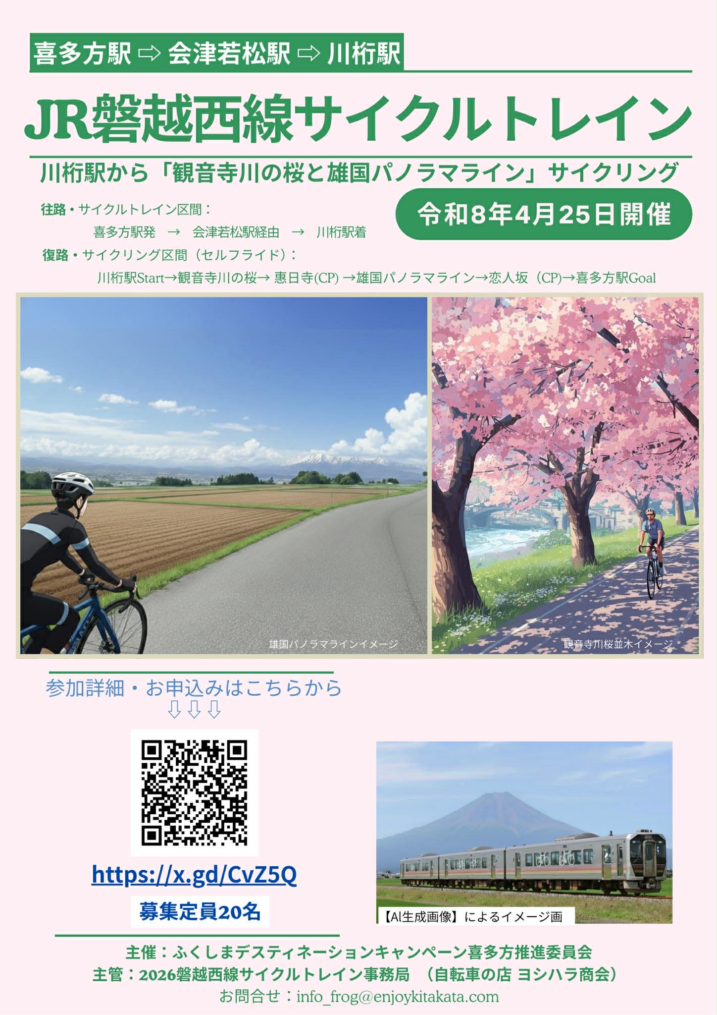 主催はふくしまデスティネーションキャンペーン喜多方推進委員会、主管は2026磐越西線サイクルトレイン事務局(自転車の店ヨシハラ商会)。会津地域の広域観光周遊促進と、継続的なサイクルトレイン運行の実現を目指す取り組みだ。