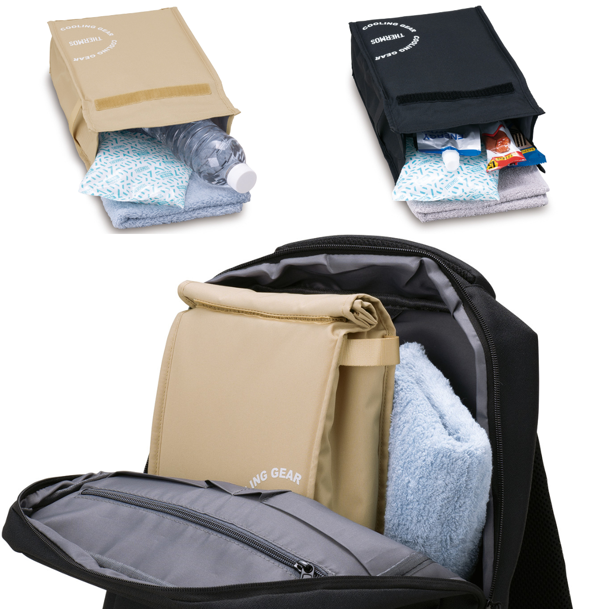 真夏の熱中症対策に最適。冷やしたタオル、ペットボトルなどを持ち運べてバッグにもすっぽり入る。サーモスオリジナル保冷剤付き。