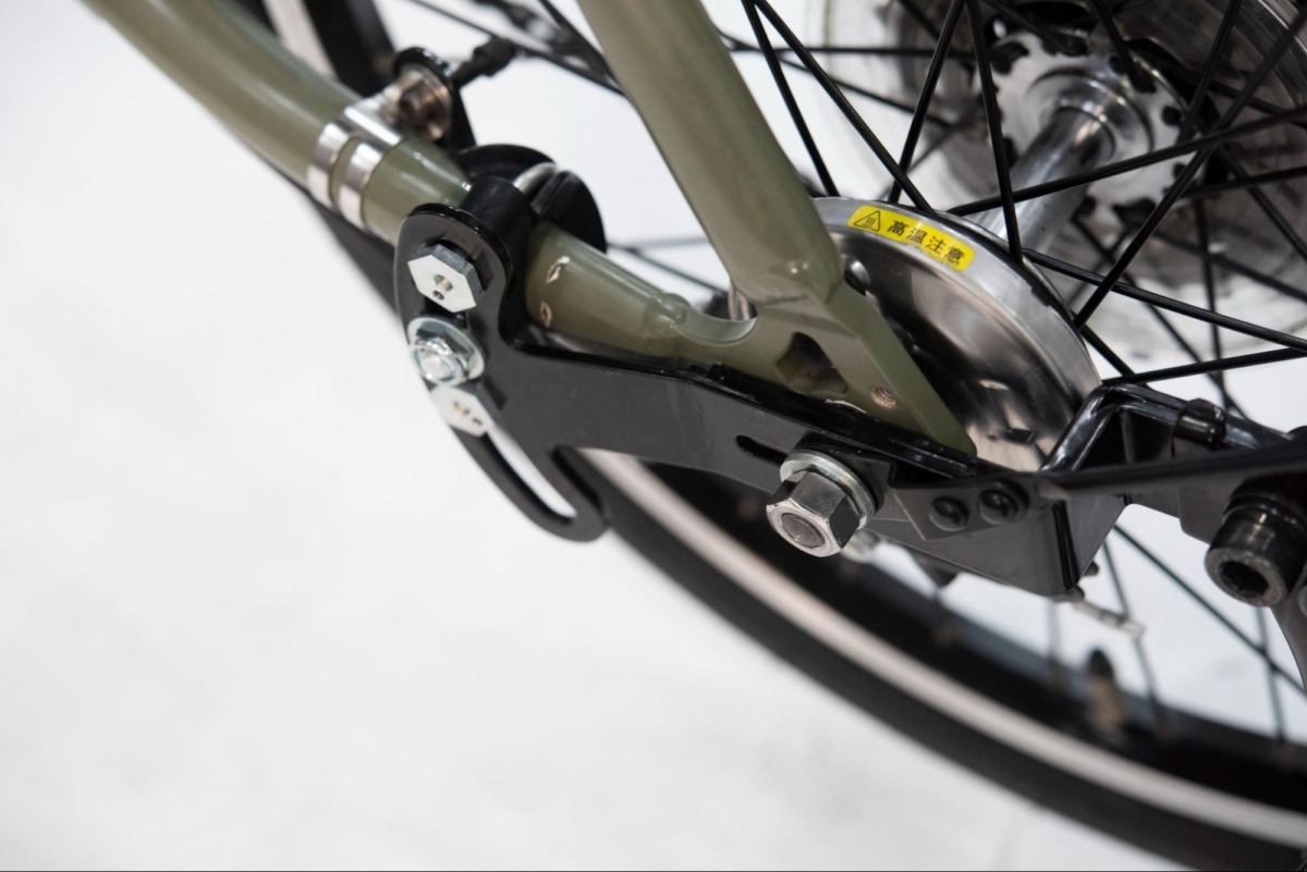和製の電動バイクによく採用されているロックナット形式の後輪固定にも対応しているスタンドアダプター。スタンドの台座が後方に装着されていることにより、電動のユニットにも干渉せずに固定できる。