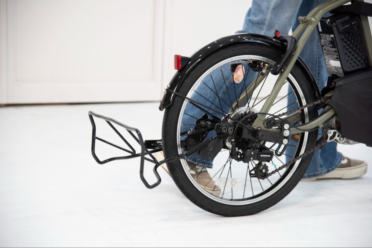 渡邉さんの自転車は電動式の小径車。車重も重く安定して自立させるのにスタンドアダプターを愛用している。ロックナット形式のこの手の車種にもしっかり対応できるのが特徴。