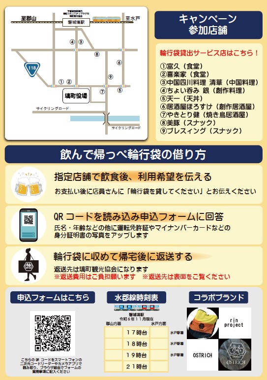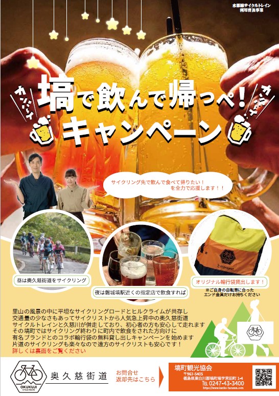 塙町観光協会及び東白川サイクリング推進会議は、水郡線サイクルトレイン支援事業として「塙で飲んで帰っぺキャンペーン」を令和8年4月1日より開始。奥久慈街道などのサイクリングを楽しんだ後、磐城塙駅近くの指定飲食店で飲食された人に、有名サイクルブランド「rin project」および「OSTRICH」とコラボしたオリジナル輪行袋を無料で貸し出すサービスだ。