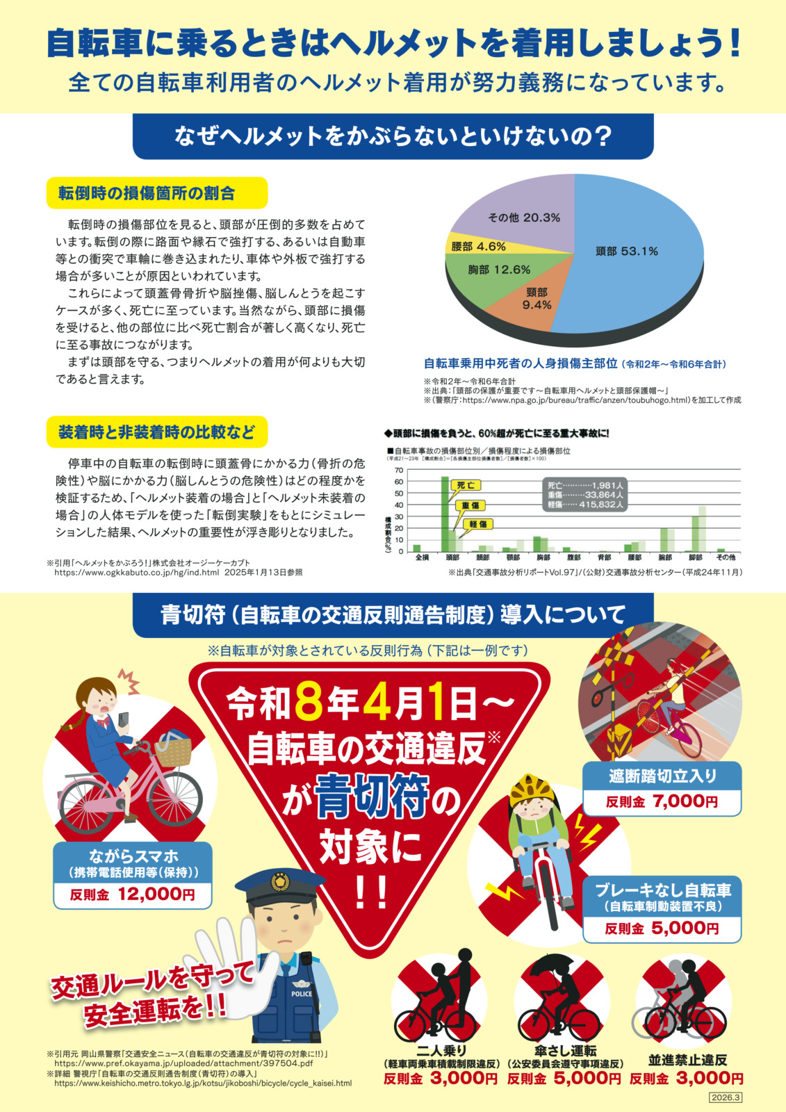 サイクリストにとって特に注目すべきは、チラシ裏面に大きく記載された「自転車の交通違反に対する青切符制度」の案内だ。2026年4月1日より、自転車の悪質な交通違反に対して反則金を科す、青切符の運用がいよいよスタートした。
