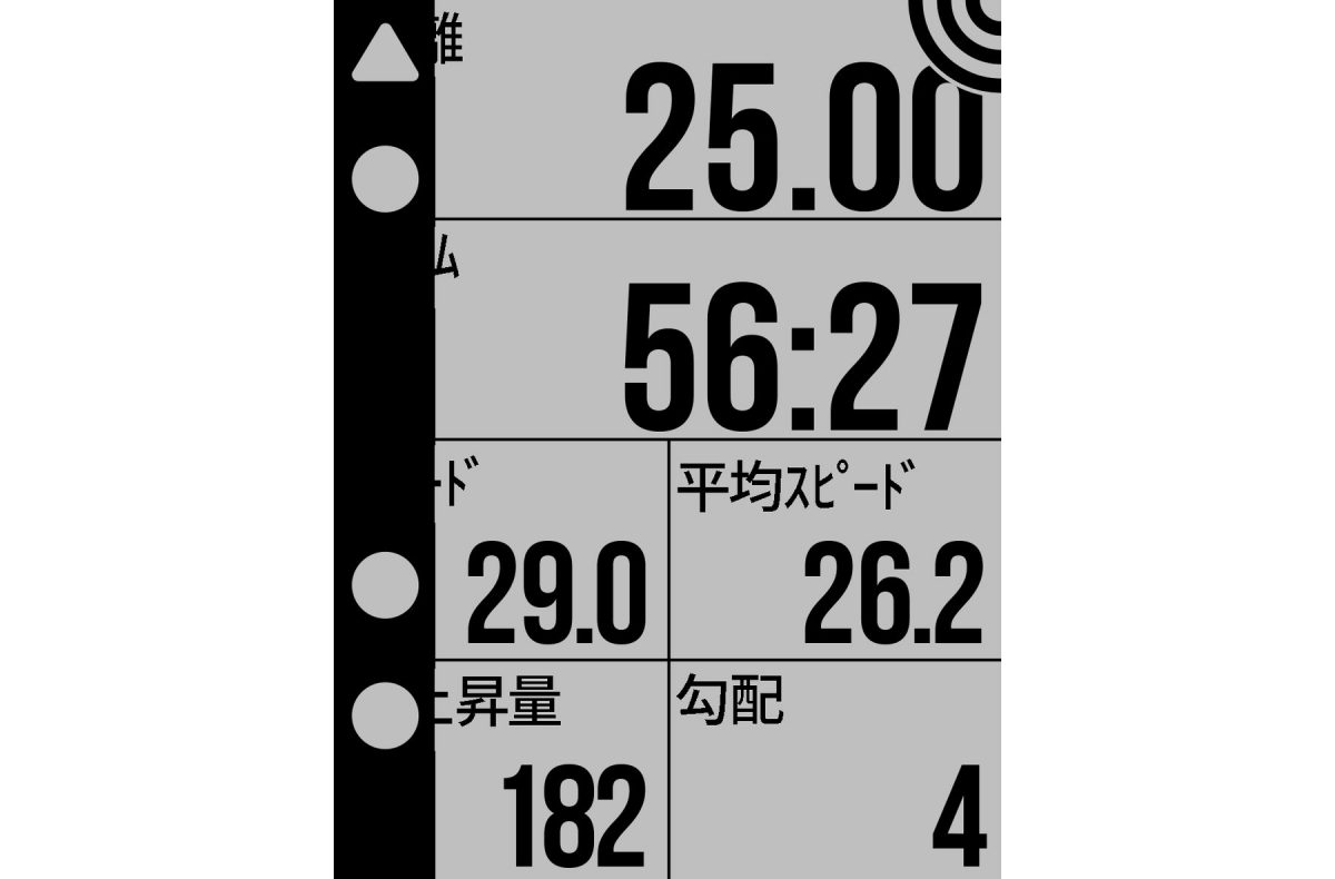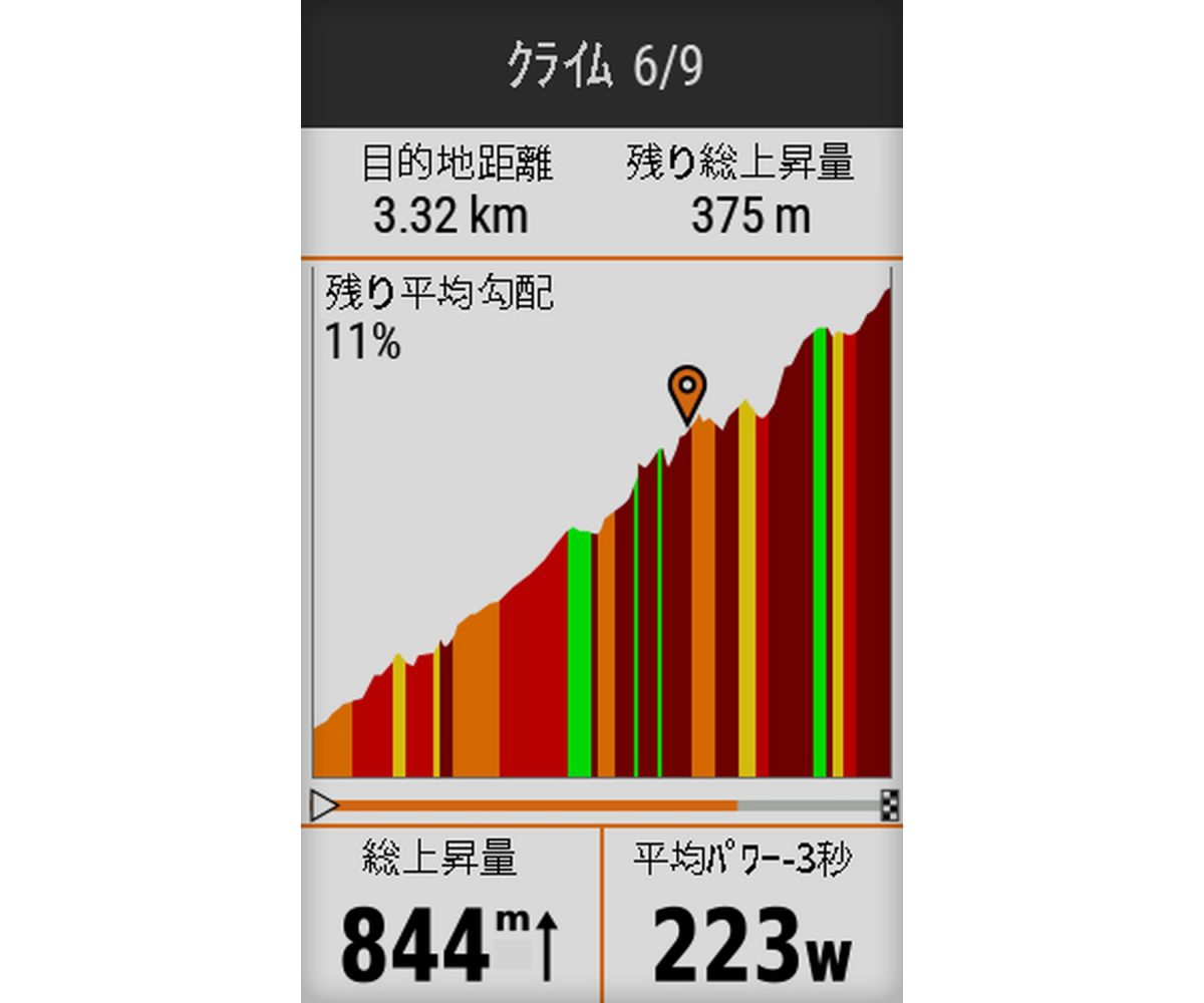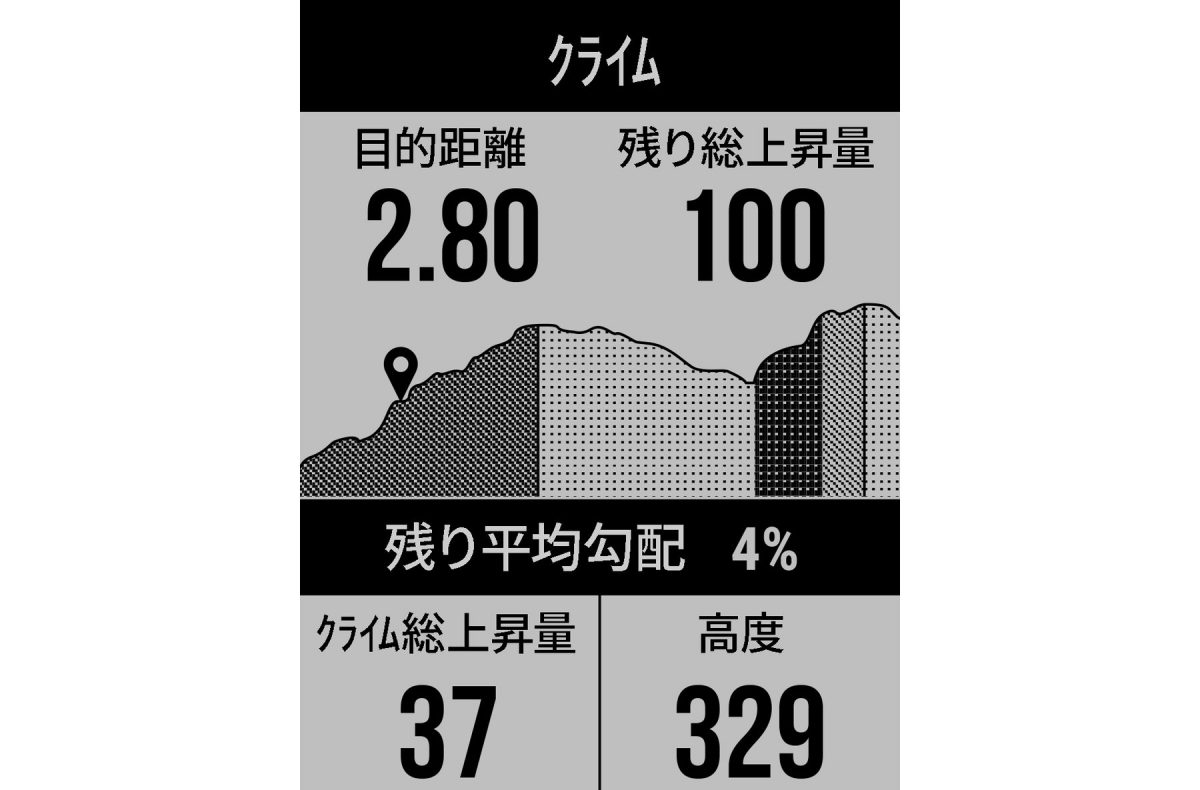 クライム中の勾配変化や残り平均斜度をグラフと数字で表示し、ヒルクライムのペース配分をアシスト。