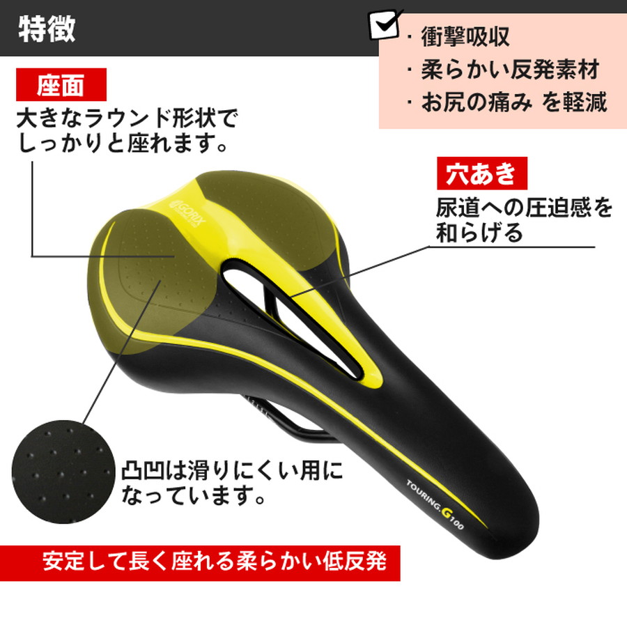 車体に合わせてカスタマイズしやすい穴あきタイプのサドルデザインでフラットシルエットとバックは大きなラウンド形状で安定して長く座れる柔らかい低反発タイプのサドルです。開口タイプのホール付きで尿道への圧迫感を和らげます。