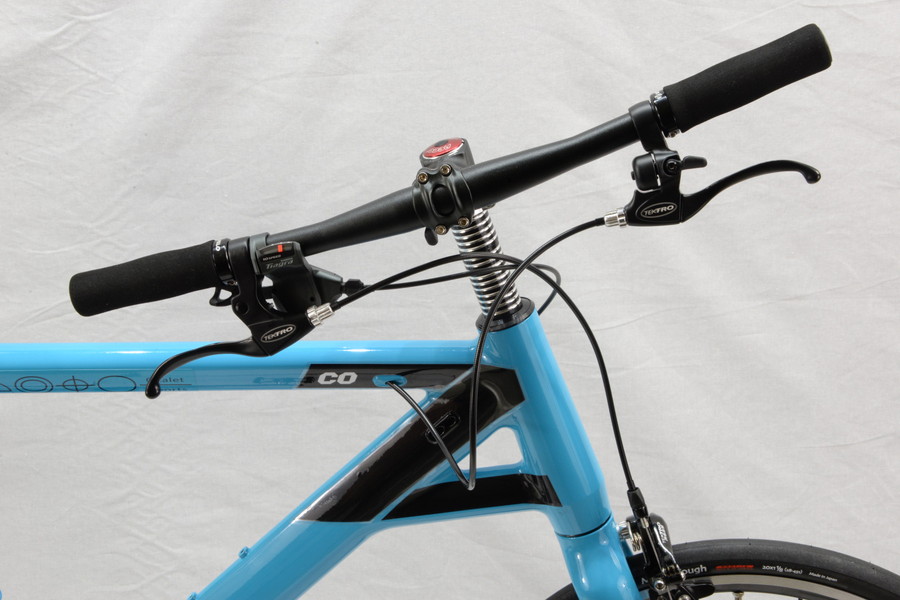 DROPモデルはドロップハンドルバーにシマノ Tiagraデュアルコントロールレバーと前後ディレイラーを搭載し、2×10 スピード。ブレーキシステムも、ロードバイク用のフラットマウント規格ディスクブレーキです。さらにカーボンファイバー製フロントフォークを装着し、最新の700C 車に負けないフルスペックロードバイクです。後は脚力次第で、700C をカモにすることもできるでしょう。