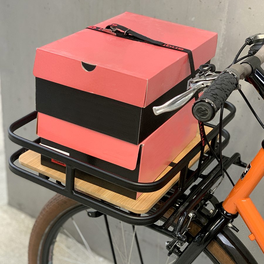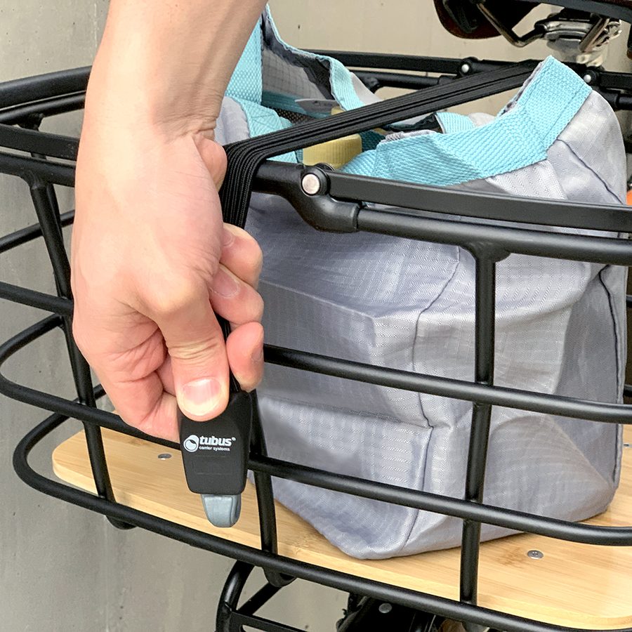 ベーカリーはトレンドデザインを取り入れた底が浅めでしっかり安定したバスケット。段ボールなどを乗せるのに便利です。走行中に荷物が動いてしまうのを防ぐために、TUBUSのフィクスチャストラップや3パートフィクスチャストラップで荷物を固定すると安定性が高まります。
