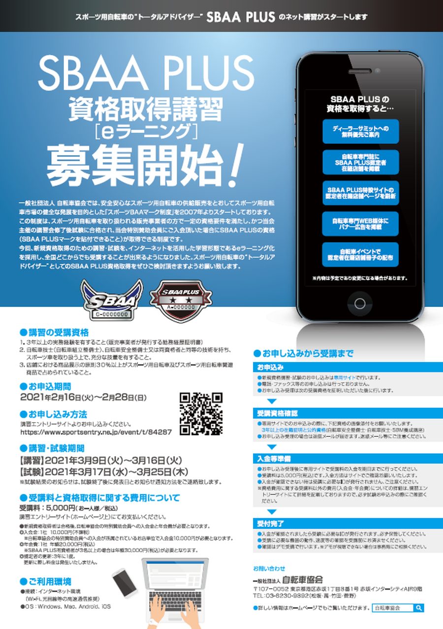 本制度は、スポーツ用自転車を取り扱われる販売事業者の方で一定の資格要件を満たし、かつ当会主催の講習会修了後試験に合格され、当会特別賛助会員にご入会いただいた場合にSBAA PLUSの資格(SBAA PLUSマークを貼付できること)が取得できる制度です。スポーツ用自転車の安全で安心な利用を消費者に正しく理解していただき、その楽しみを伝える担い手となる人材にとっては必要な資格となります。