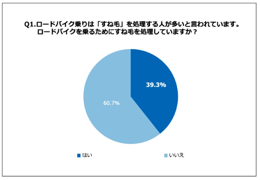 「Q1.ロードバイク乗りは「すね毛」を処理する人が多いと言われています。 ロードバイクを乗るためにすね毛を処理していますか?」 (n=107)と質問したところ、 「はい」が39.3% という回答となりました。