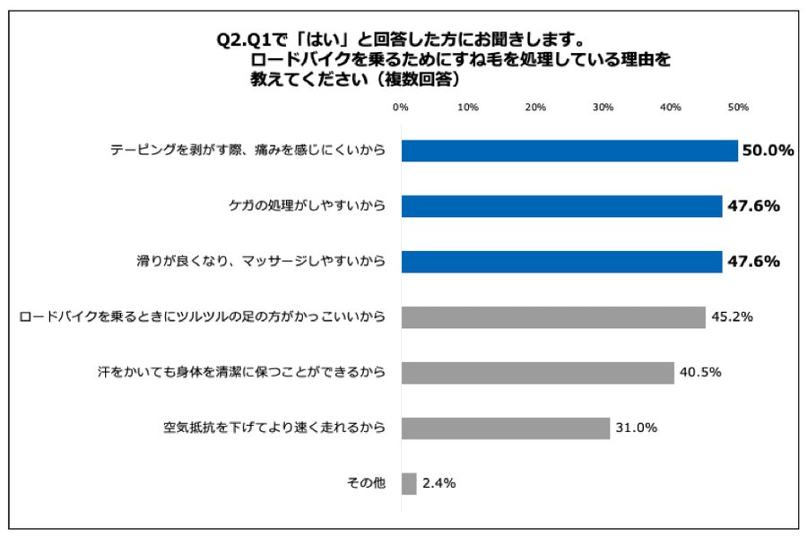 Q1で「はい」と回答した方に、 「Q2.ロードバイクを乗るためにすね毛を処理している理由を教えてください(複数回答)」 (n=42)と質問したところ、 「 テーピングを剥がす際、 痛みを感じにくいから」が50.0%、 「ケガの処理がしやすいから」が47.6%、 「滑りが良くなり、 マッサージしやすいから」が47.6% という回答となりました。