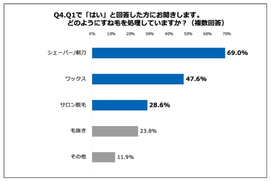 Q1で「はい」と回答した方に、 「Q4.どのようにすね毛を処理していますか?(複数回答)」 (n=42)と質問したところ、 「シェーバー/剃刀」が69.0%、 「ワックス」が47.6%、 「サロン脱毛」が28.6% という回答となりました。