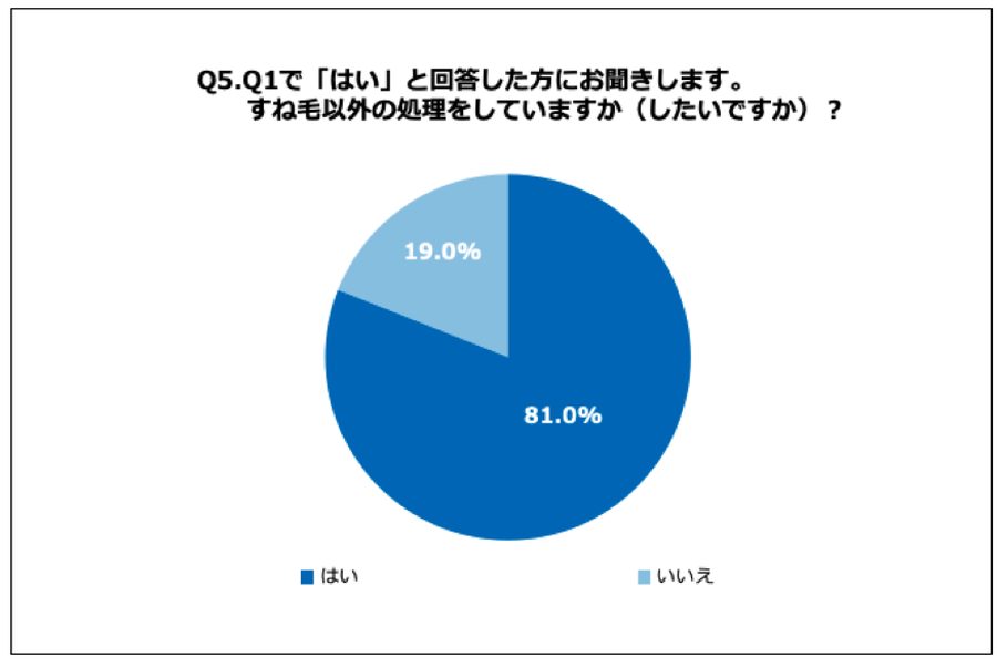 Q1で「はい」と回答した方に、 「Q5.すね毛以外の処理をしていますか(したいですか)?」 (n=42)と質問したところ、 「はい」が81.0% という回答となりました。