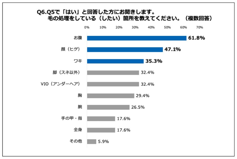 毛の処理に関心の高い箇所、 61.8%が「お腹」、 47.1%が「顔(ヒゲ)」