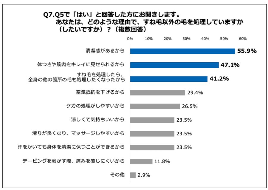 Q5で「はい」と回答した方に、 「Q7.あなたは、 どのような理由で、 すね毛以外の毛を処理していますか(したいですか)?(複数回答)」 (n=34)と質問したところ、 「清潔感があるから」が55.9%、 「体つきや筋肉をキレイに見せられるから」が47.1%、 「すね毛を処理したら、 全身の他の箇所の毛も処理したくなったから」が41.2% という回答となりました。