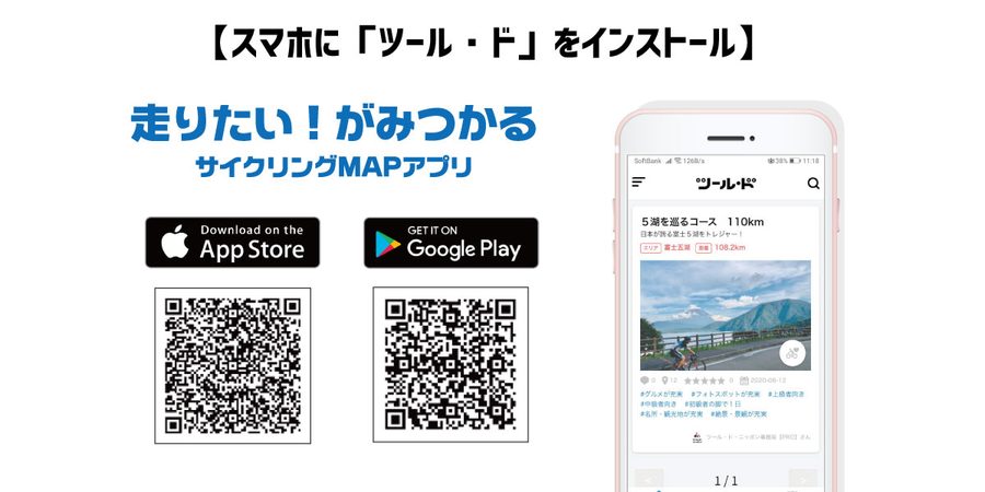 サイクリング専用アプリ「ツール・ド」は、全国のおすすめサイクリングコースが検索でき、選んだコース MAP をスマホで確認しながらサイクリングを楽しめる、サイクリング観光に特化したアプリです。