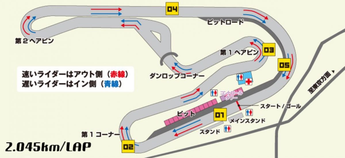 都心から70分という好立地にあり、コースはほとんど高低差がなく、そして道幅も広く走りやすいのでビギナーでも参加しやすいのが特徴。また、サーキットの中でも比較的コンパクトな設計なので、会場からの応援がしやすいのも魅力的。ただし、2つのストレートと大小8つのコーナーは少々テクニカル!真夏の暑さも加わり玄人も満足のレース展開となること間違いなしです。