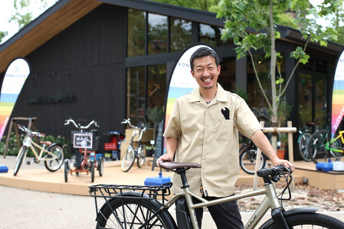 京都市北区の大宮交通公園が、自転車を通じて学び、楽しみ、交流する場、また憩いの場を提供するサスティナブルパークとしてこの4月にリニューアルオープンしました。豊かな自然の中、管理事務所、サイクルセンター、コミュニティールームの機能を備えた建物とともにもうひとつ目を引く施設が…コンズサイクルのコンセプトショップ「Kon’s Green Park」です。資料には、自転車を通じて『サスティナブル』な社会の実現に向けた活動を実践していく…と記載が。今回はそのキーマンである、営業企画室 室長の近藤大督さんに、コンズサイクルがサスティナブルな活動に取り組む理由について伺いました。