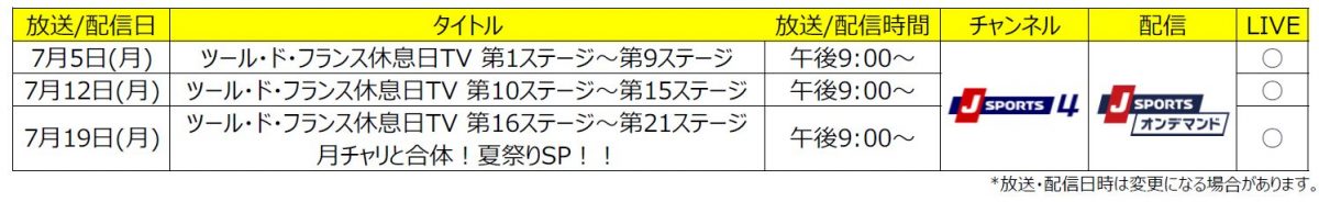 今年のツール・ド・フランス中継では皆様のご要望にお応えし、4 年ぶりに「休息日 TV 」が復活します。ツール・ド・フランスは楽しみたいけれど毎日長時間の中継を視聴するのは難しい、注目のステージを見逃してしまった、そんな方も休息日に前週のレースを 60 分で振り返る「休息日 TV 」を見るだけで、その週のトピックやフィニッシュシーンをチェックできます。また閉幕日 7 月 18 日 日の翌日 19 日 月 には「休息日 TV 月チャリと合体!夏祭 SP !!」を生中継。お馴染みの解説・実況陣がそろってツール・ド・フランス第 3 週はもちろん、春のクラシックやジロ・デ・イタリアなどサイクルロードレース 2021 シーズン上半期を一気に振り返ります。