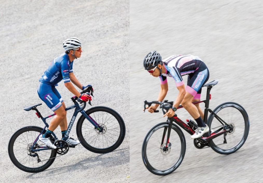 レース目線の管洋介さん(左)とツーリング目線の鈴木祐一さん(右)がハードか、マイルドかを示す「踏み応え」、そして平地巡行やヒルクライムでの性能で用途適正し評価した。