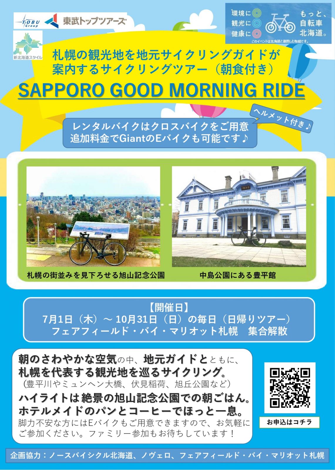 「もっと、 自転車 北海道。 」は、 自転車が持つメリット・効果や正しく安全な利用の啓発により、 環境負荷の低減や健康増進等を含むSDGsの推進や観光振興などに資する自転車の幅広い利用の促進を目指して北海道が推進している事業です。 今般本事業と連携する取り組みとして、 朝の時間帯を有効活用し、 朝7時に出発して札幌市内を周遊し、 9時半に戻ってくる新しい旅のスタイルでのサイクリングツアー「SAPPORO GOOD MORNING RIDE」を販売することとなりました。 このツアーは7月1日から10月31日の間の毎日実施を予定しており、 自転車の有無にかかわらず気軽に参加でき、 朝のすがすがしい空気を感じながら、 札幌市街を見渡せる旭山記念公園や、 京都 伏見稲荷大社の分社である札幌伏見稲荷神社などのスポットを自転車で周ります。 北海道内外からの旅行者をはじめ、 地元住民の方も参加することができ、 自転車を通じた交流の場を提供していきたいと考えております。