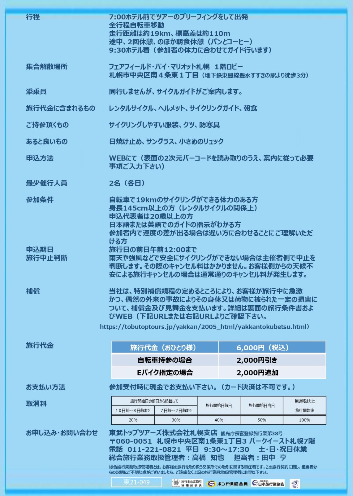 東武トップツアーズ(株)札幌支店 TEL 011-221-0821 (平日 9:30~17:30、 土日祝休)