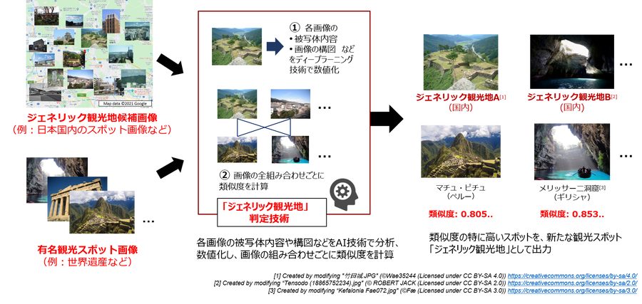 『ジェネリック観光地』判定技術」とは、ドコモのAI技術を活用して海外の世界遺産や絶景などの有名スポットに似た日本の各地のスポット画像がどれだけ似ているか(類似度)をAI技術によって算出する技術です。