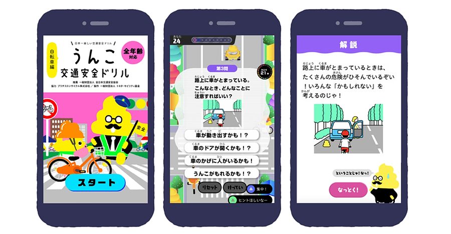 ・ドリルに比べてより細かい自転車乗車中の注意事項に加え、複雑な道路環境における対応方法、自分が加害者になるリスクや自転車損害賠償保険の重要性等についても「うんこ先生」がわかりやすく解説します。 *ゲーム利用料は無料。ただし、通信費がかかります