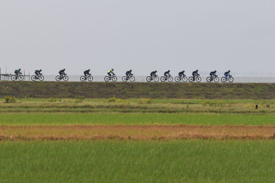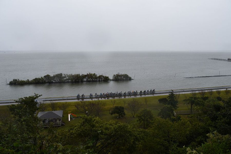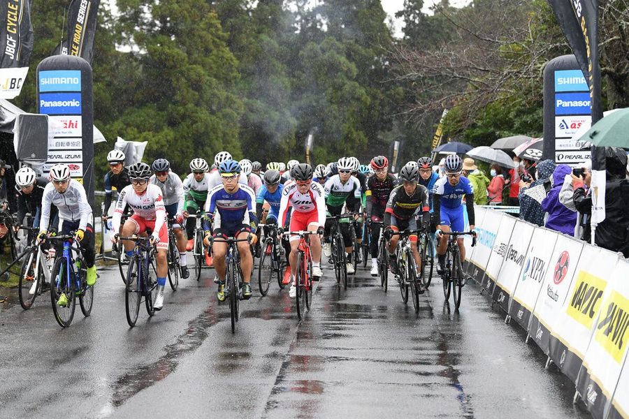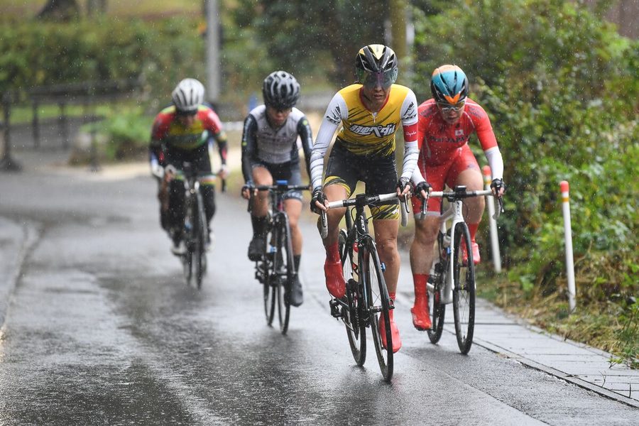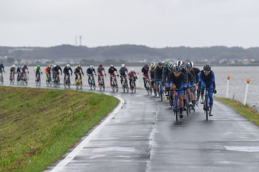 2021年のJプロツアー最終戦は、初開催の「かすみがうらロードレース」。前日のタイムトライアルとは別に、アップダウンのある1周4.8kmのコースを設定。霞ヶ浦の湖畔を走る部分は共通となるものの、コース幅の急な変化や、残り400m付近からは短距離ながらも急斜度の登りが集団を引き伸ばすハードなコースだ。加えて今回のレース当日は朝から雨が降り続き、雨がやんだ後も13℃前後の低い気温と強めの風が選手を苦しめた。