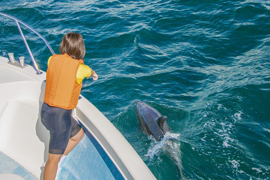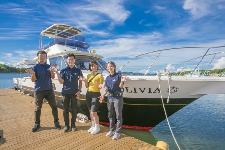 1年を通じて98%の確率で野生のイルカに出会えるという、クルーズ船によるイルカウォッチングツアー。スタッフもみんな若くて元気! 受付はミオ・カミーノ天草にある。