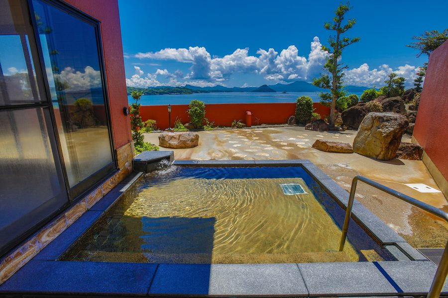 九州といえば温泉! 上天草にも温泉宿や立ち寄り湯が多くある。海を見ながらの露天風呂を楽しみたい。写真はホテル松竜園 海星。