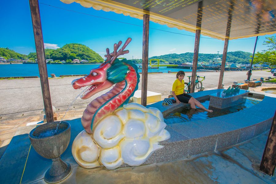 5号橋(松島橋)を望む合津港にある無料の足湯。龍の伝説にちなんでいる。「足湯大好き。見つけたら入ります」とmizuさん。