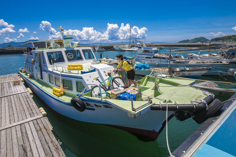 「ネコの島」として知られる湯島。旅客船は自転車もデッキに置かせてもらえる(別料金)。ネコの足跡を描いた灯台などを見た後は、帰りの船が来るまでネコとのんびり過ごしてみては。