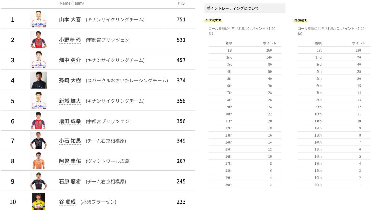 個人ランキングのポイントレーティングは、大田原ロードが★★(優勝260ポイント)、クリテリウム2大会が★(優勝130ポイント)となる。残る3戦を全て優勝すると合計520ポイント獲得でき、現在ランキング9位の石原悠希(チーム右京相模原)までチャンスが残る計算だが、実質的には現在リーダーの山本大喜(キナンサイクリングチーム)、2位の小野寺玲(宇都宮ブリッツェン)の一騎打ちと見ていいだろう。