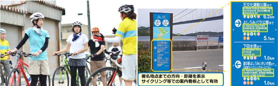 左/サイクリングガイドの養成 右/多⾔語案内や注意看板の設置