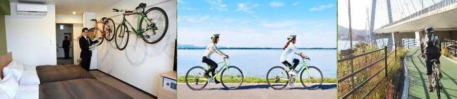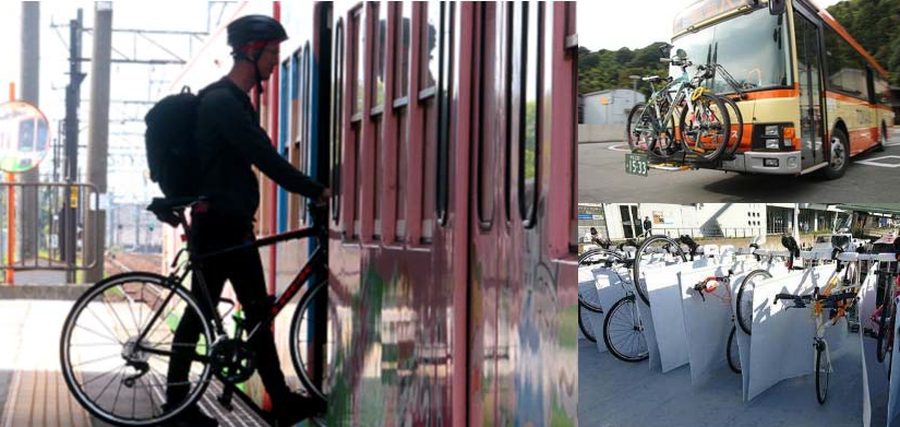 左/サイクルトレイン(近江鉄道) 右上/サイクルバス(東海バス) 右下/サイクルシップ「ラズリ」(JR西日本イノベーションズ)