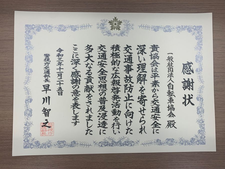 一般社団法人自転車協会(以下、自転車協会)が展開している交通事故防止に向けた広報活動が認められ、警視庁の「令和3年秋の交通功労者等表彰」において特別優良団体として交通部長から表彰された。